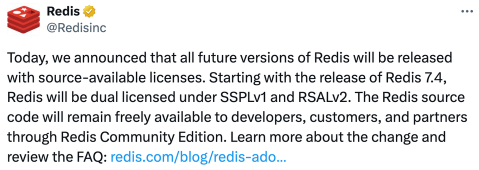 3月20日,Redis商业公司Redis Labs CEO Rowan Trollope宣布,Redis从7.4版本开始,未来所有版本将从 BSD 3-Clause协议修改为 Redis 源代码可用许可证(RSALv2)和服务器端公共许可证(SSPLv1)双重协议。修改许可证后,Redis公司承认Redis不再是OSI(开源促进会Open Source Initiative)定义下的开源软件,虽然Redis的源代码将继续对开发者开放,但在商业化应用Redis时,用户需要更加谨慎。
