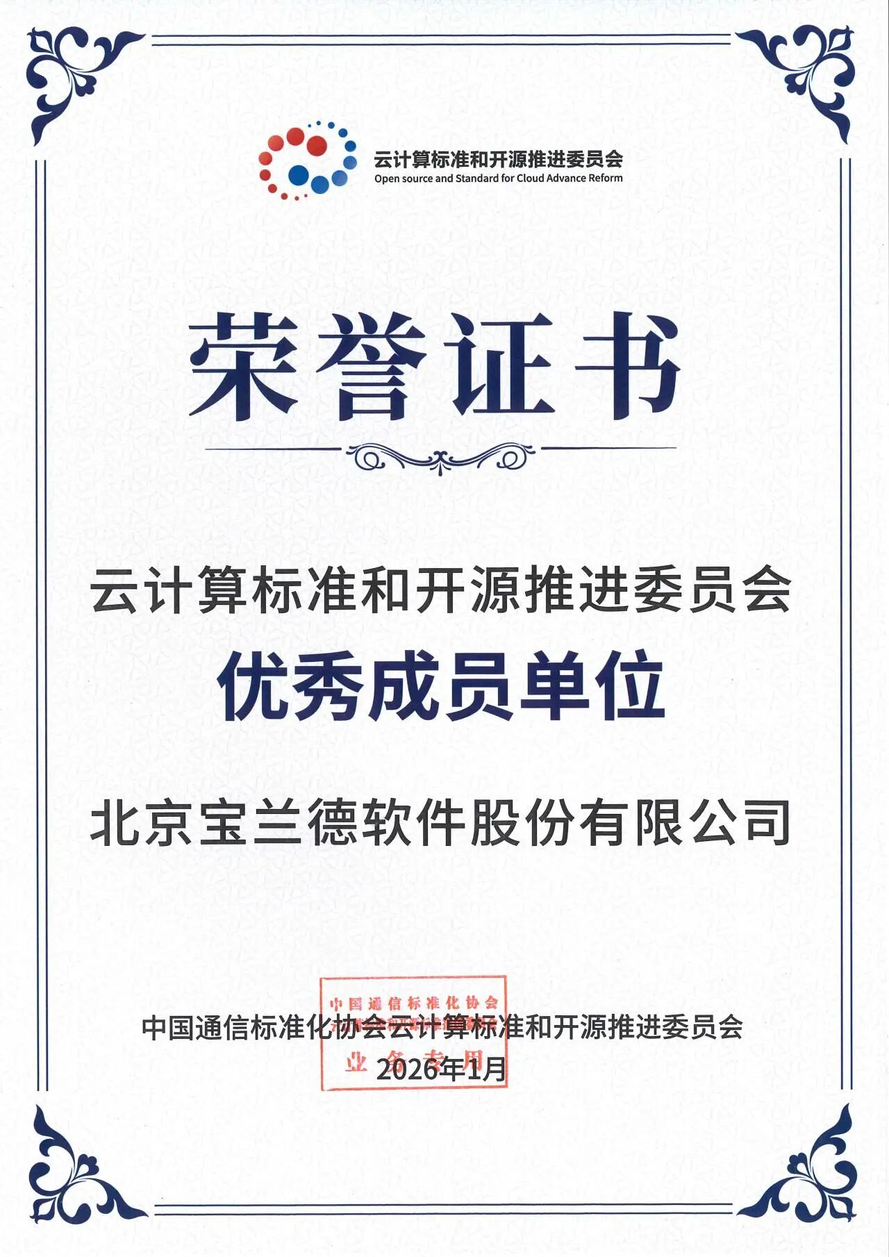 此次获评“优秀成员单位”,既是行业对宝兰德技术实力与标准化工作成果的高度认可,也彰显了公司在推动我国云计算产业规范化、高质量发展进程中的重要角色。未来,宝兰德将继续秉持开放合作、创新驱动的理念,携手产业链各方,深化标准研究与开源协同,为打造安全、高效、自主可控的云计算基础设施继续贡献力量。