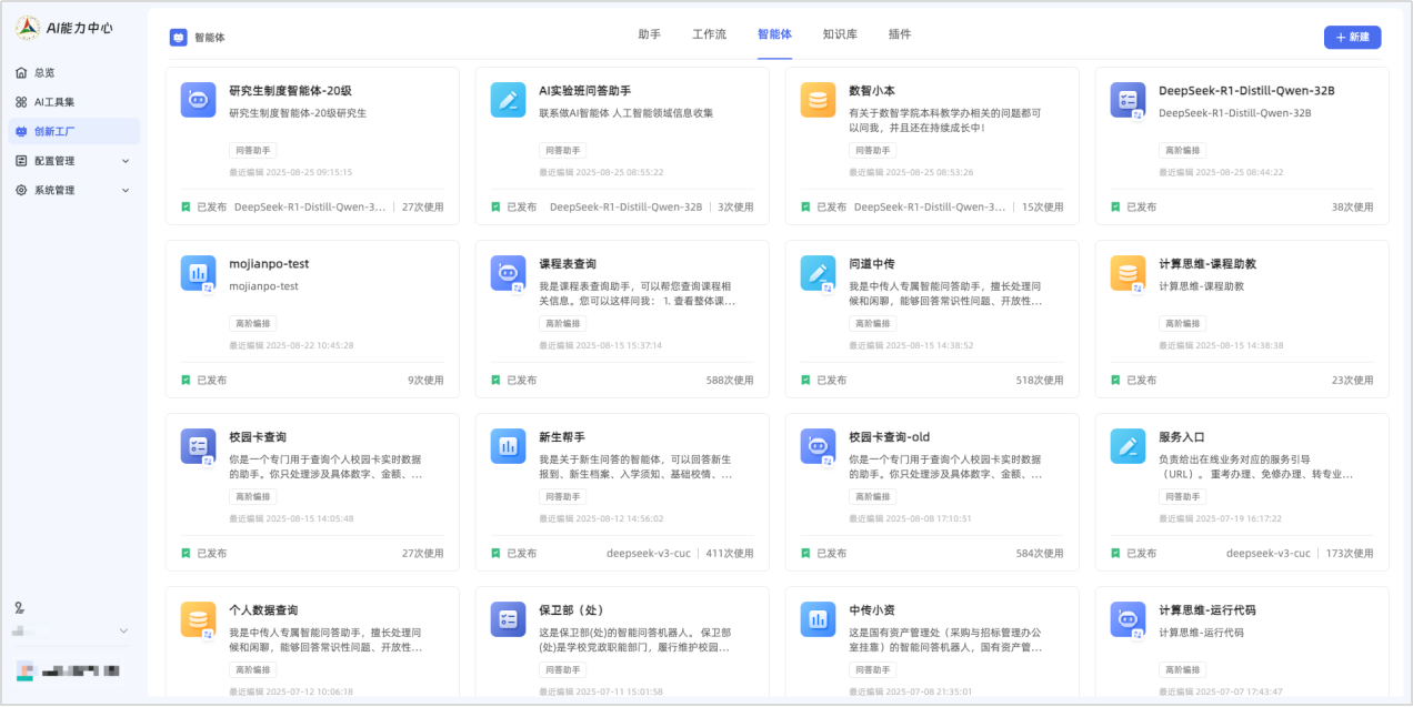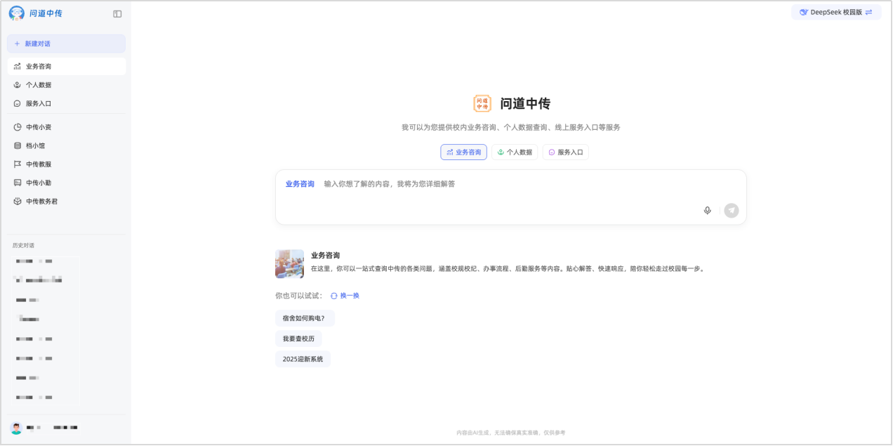 1个“问道中传”+N(40+)“业务智能体”,问道中传构建AI范式下统一咨询入口,“N”个智能体有业务部门搭建,基于业务复杂度不断衍生,共同创建一个集面向学生/教师学习、生活、工作于一体的AI助手