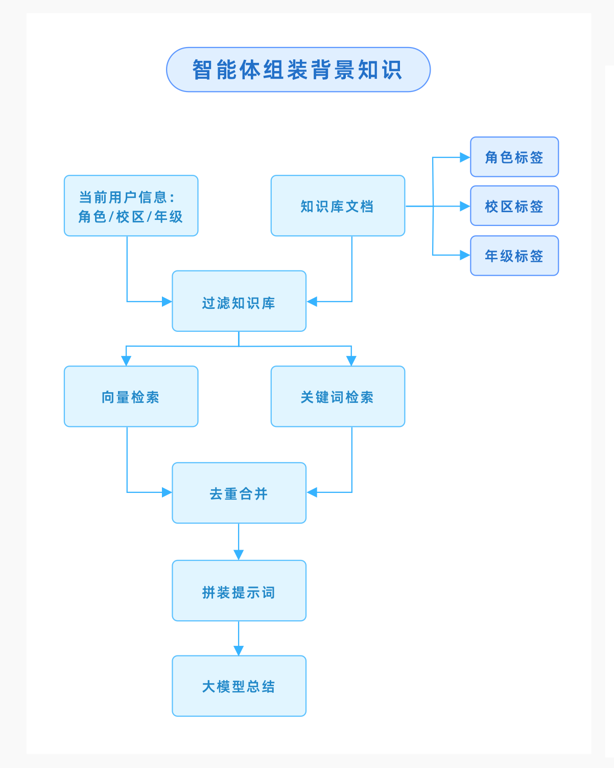 • 基于RAG检索召回流程的知识库标签体系构建:融合用户信息、角色、地理位置、年纪信息进入智能体背景知识中,精准定位并召回相关知识片段