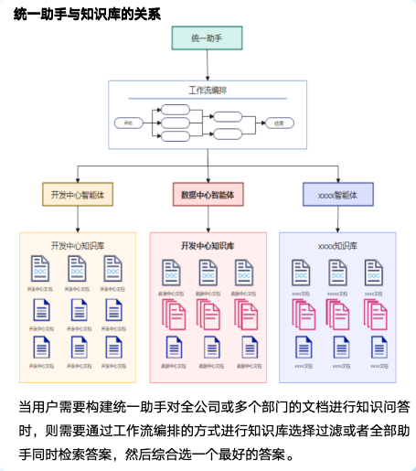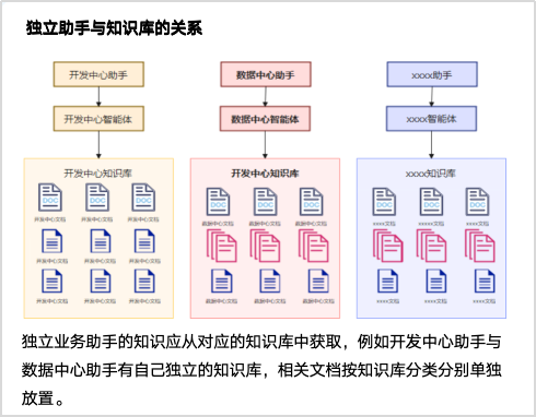 • 知识库构建规范:由于助手存在两级嵌套能力,在构建知识库时可根据当前业务诉求拆分或组合文档构建知识库,增加问答准确率。
