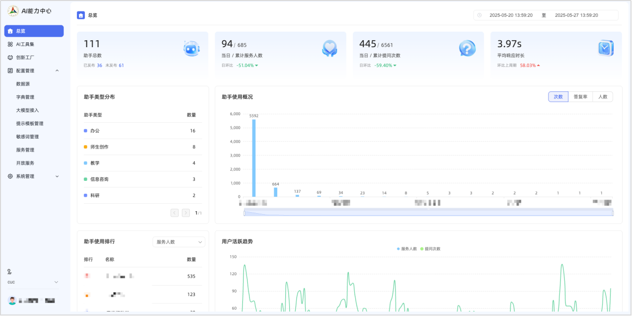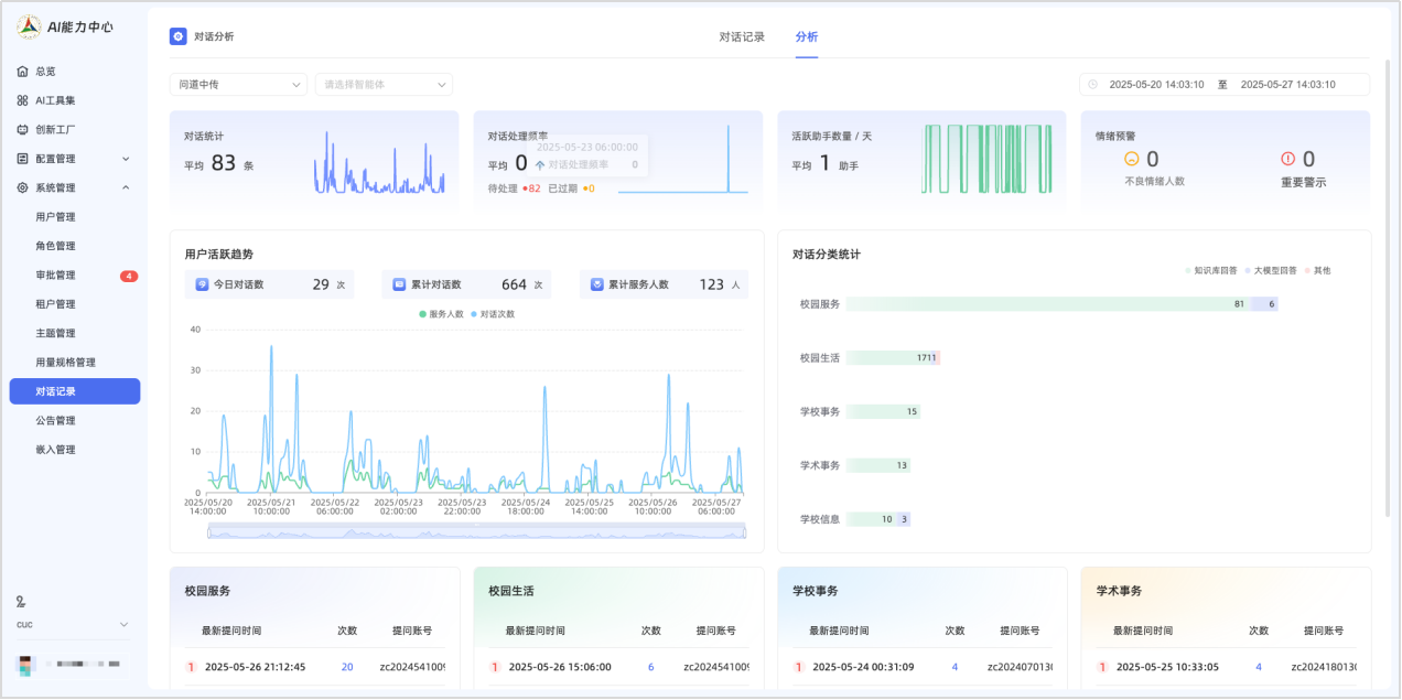 问道中传以数据驱动的运营与分析能力,为高校智能服务构筑起高效、安全、可持续的管理体系。系统通过对用户使用情况的精准洞察,帮助管理者快速定位关键信息;同时基于对话数据实现风险抓取与预警,确保服务合规与安全;并结合知识库活跃度与更新状态的持续呈现,支撑知识库的周期性治理与迭代优化。三者协同作用,不仅提升了校园智能服务的响应效率与安全性,也为智慧校园的可持续发展注入了坚实动力