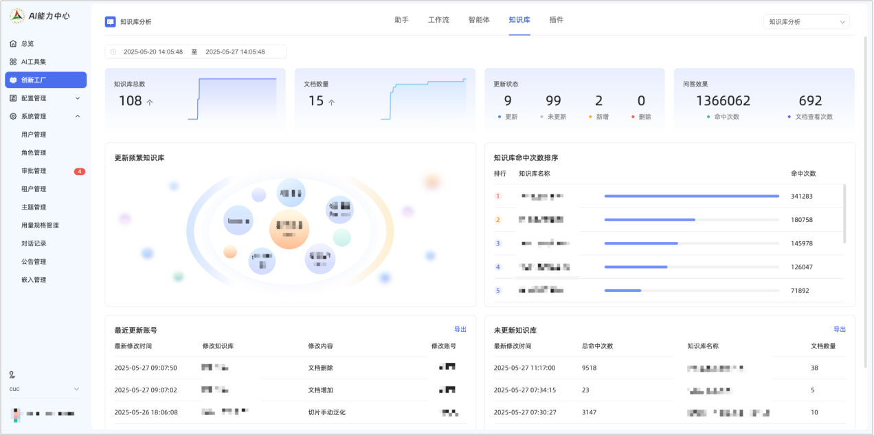 (3) 知识库运营分析:知识库治理是周期性持续管理工作,知识库运营分析界面提供知识库活跃度、更新状态等信息呈现