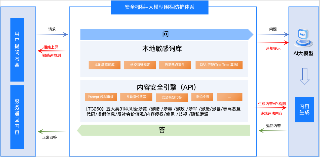 通过安全栅栏的构建,中传问道实现了对高校场景下敏感内容的高效、精准把控。本地词库快速拦截固定敏感词,第三方API则增强复杂与动态内容的识别能力,两者协同作用,不仅大幅提升了内容安全的覆盖率和准确性,还为高校智能问答服务提供了坚实的合规保障。这一策略有效平衡了安全性与应用灵活性,推动校园数字化建设在可控、可信的环境中持续发展。