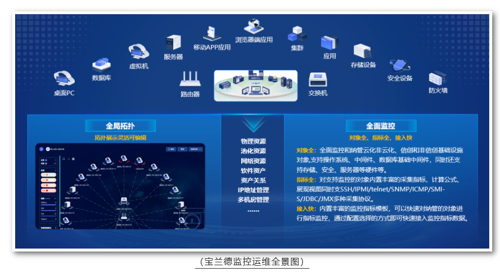 与此同时,宝兰德还不断补齐监控产品,实现全栈融合监控和云原生可观测力,全面助力自动化、数智化运维新场景。在应用性能管理软件WebGate APM 基础上,宝兰德推出了基础设施监控软件、容器监控软件、业务性能管理软件、应用可用性探测软件、用户体验类监控软件等产品,为企业级用户提供从硬件、网络、软件到业务系统的IT资源全栈式监控及管理服务,贯穿客户端、网络和服务端,覆盖基础设施、云化资源、应用、业务等多个监控维度,从全局的视角反应业务系统整体运行态势,实现故障的快速定位和根因诊断,提升政企用户的监控和运维管理能力。
