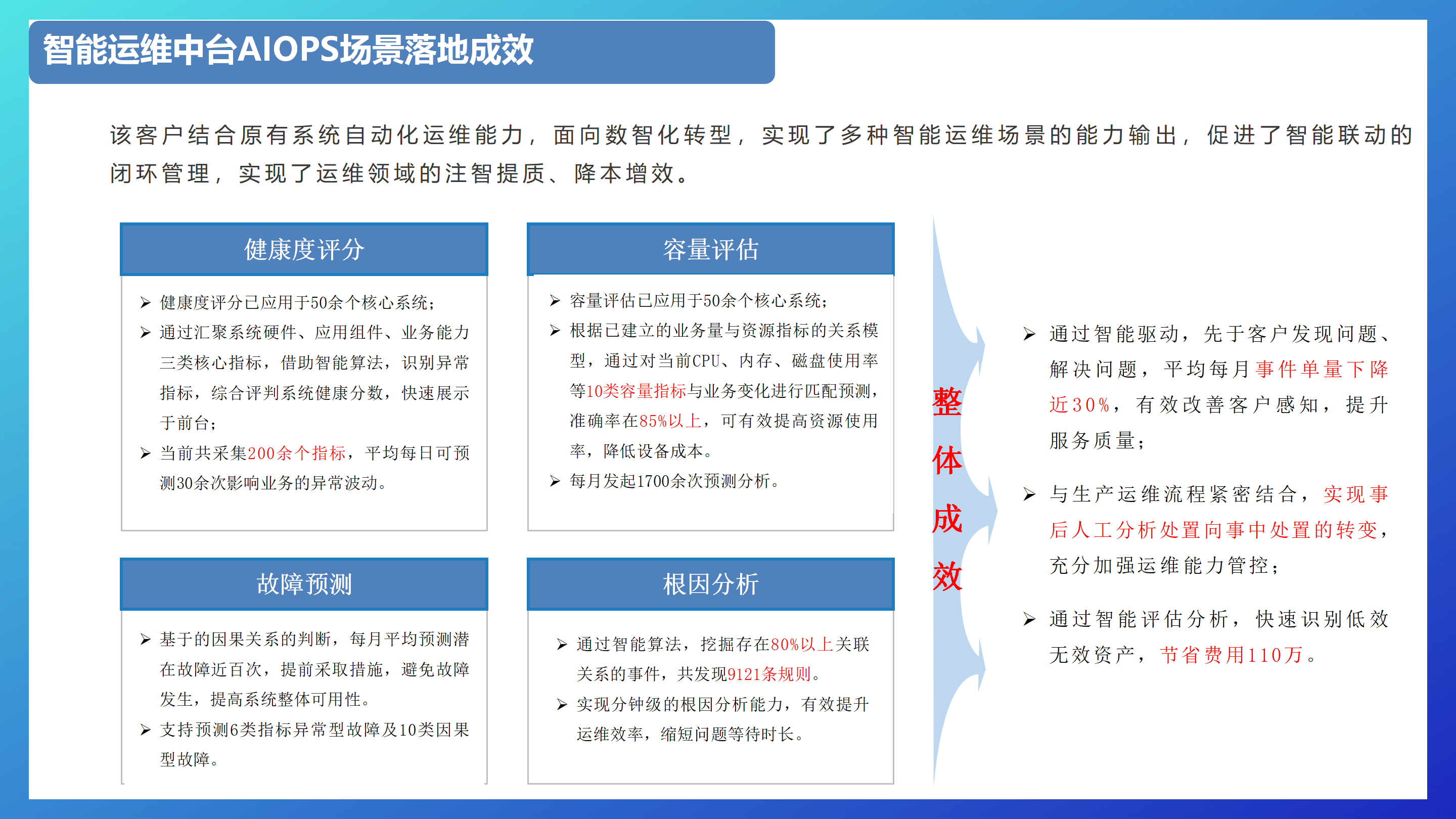 赵艳兴以某大型客户为例,展示落地解决方案:宝兰德为客户建设了监、管、控一体化的智能运维中台,通过智慧运维中台提供通用数据采集方案融合各运维工具相关数据,数据统一存储、分析,通过指标辨析中心、智能预测中心、智能定位中心等六大中心,灵活应对多运维场景变化需求,沉淀智能运维场景模型,解决了运维能力分散,智能化程度低的问题。AI算法使运维全面注智,从运维成本管理、效能评估、质量管理等多个角度全面提升运维智能化程度。例如通过健康度评分场景可以让用户及时的掌握系统的健康状况,提供运维决策;通过根因分析,告警收敛,帮助用户提高故障定位效率;通过容量评估、低效资产分析可以帮助用户提升资源利用率;通过故障预测和故障自愈场景,可以帮助用户降低故障率,提升业务系统健壮性。这些众多的智能化场景从多个维度充分发挥了AI的能力,对传统运维有了质的飞跃。