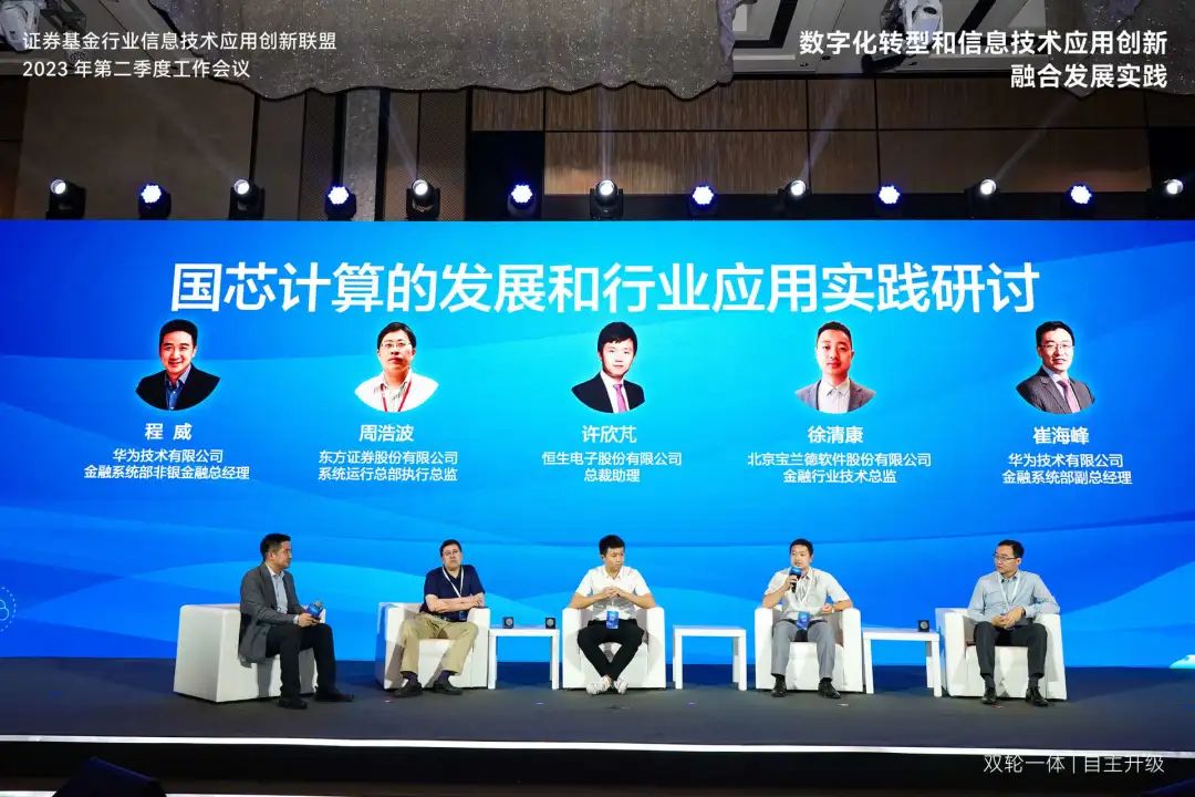 在会上,宝兰德金融行业技术总监徐清康与华为金融系统部非银金融总经理程威、华为金融系统部副总经理崔海峰、东方证券系统运行总部执行总监周浩波、恒生电子总裁助理许欣芃,共同就《国芯计算的发展和行业应用实践研讨》这一主题,进行了一场精彩的圆桌会谈。