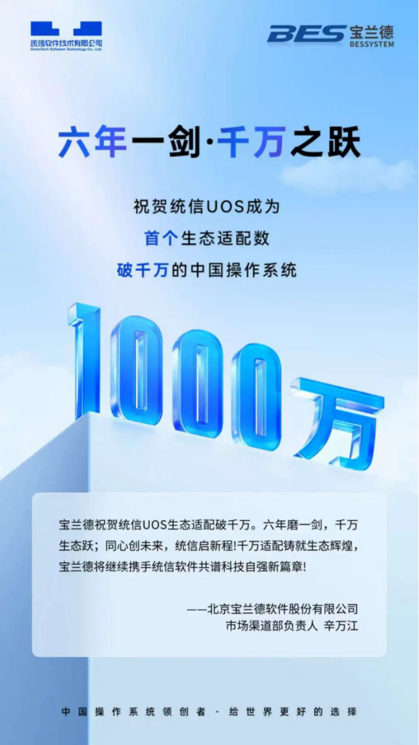 “千万生态适配”是一个辉煌的里程碑,更是信创事业迈向“十五五”新征程的起点。宝兰德谨向统信软件致以最热烈的祝贺!