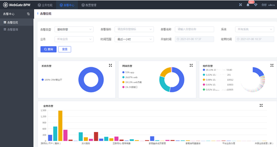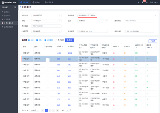 WebGate BPM支持任意内容的配置、采集、分析、展示,选择任意维度进行多层递进的分析统计,方便用户快速、灵活地逐步锁定需要分析的维度,例如系统、业务、渠道、营业厅、用户标识等运营和运维层面的维度进行量化分析。