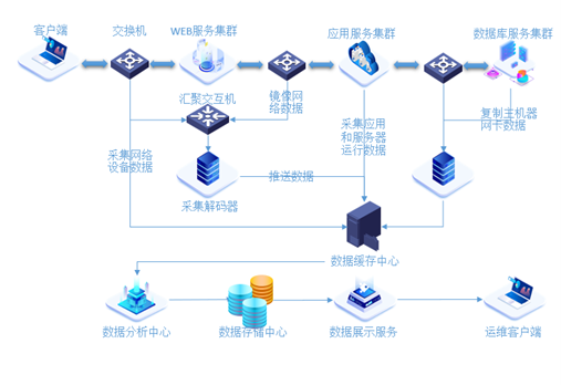 为了更好的保证现场实施效果,我们采用了经过多次测算测试得到的最优组合配置(使用一定数量的TAP交换机进行流量镜像复制,一定数量的物理服务器部署WebGate BPM数据采集模块,一定数量的虚拟机部署数据清洗、数据分析重组、数据存储、前端展示模块)。采集层对原始报文进行IP过滤、数据解密、协议解码、请求响应关联,再通过消息队列发送给数据清洗、分析重组模块进行处理,最后进行持久化存储和前端展现处理。宝兰德业务性能管理方案对业务系统零侵入,业务代码不需要做任何改动,非常易于实施。