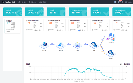 WebGate BPM支持服务路径和应用架构根据数据自动更新,以拓扑图方式直观呈现,形成立体全面的业务监控模型,实现单笔业务调用和整体业务系统架构动态可视化展现。