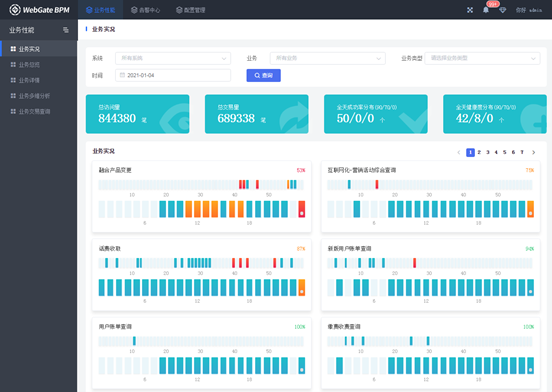 宝兰德业务性能管理WebGate BPM是一站式业务端到端性能监控平台,基于大数据和人工智能算法,对交换机流量镜像数据进行报文和Java应用核心底层数据分析,还原业务办理流程,直观展现每一操作步骤的耗时情况,帮助客户迅速发现和定位业务问题根源,提供企业上云前、中、后的全面业务健康度分析能力,保障系统长期稳定运行