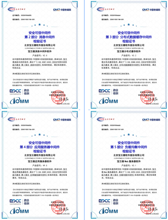 宝兰德核心产品线,包括消息中间件(BES MQ)、负载均衡中间件(BES WebServer)、分布式数据缓存中间件(BES CacheServer)以及应用服务器中间件(BES Application Server)全部通过评估,荣获“安全可信中间件”认证。这一“大满贯”式的成果,再次彰显了中国信通院对宝兰德产品技术实力与安全可靠性的高度认可。