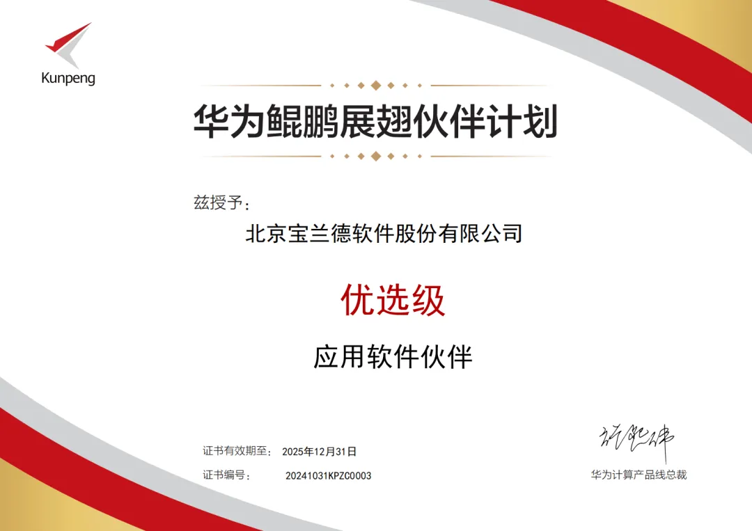 (图:宝兰德获“华为鲲鹏优选级应用软件伙伴”认证证书)