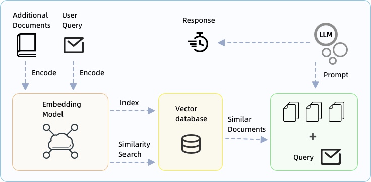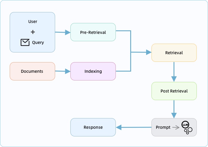 ● 文档存储和索引:用于存储和索引外部知识库的内容,通常使用向量数据库实现。向量数据库能够高效地存储和检索高维向量数据,为快速检索提供支持。