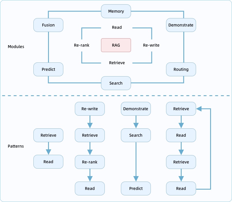 模块化RAG将检索和生成管道细分为多个独立的模块,这种模块化设计允许根据不同需求进行灵活配置和优化。它结合了稀疏检索(如传统的关键词匹配)和密集检索(如基于向量的语义检索)方法,根据查询类型的不同,灵活选择最合适的检索方式,以提高检索效率和准确性。同时,它支持与外部API、数据库等多种工具进行集成,拓展了数据来源和处理能力,适用于复杂多领域的任务,如金融分析、法律研究等。