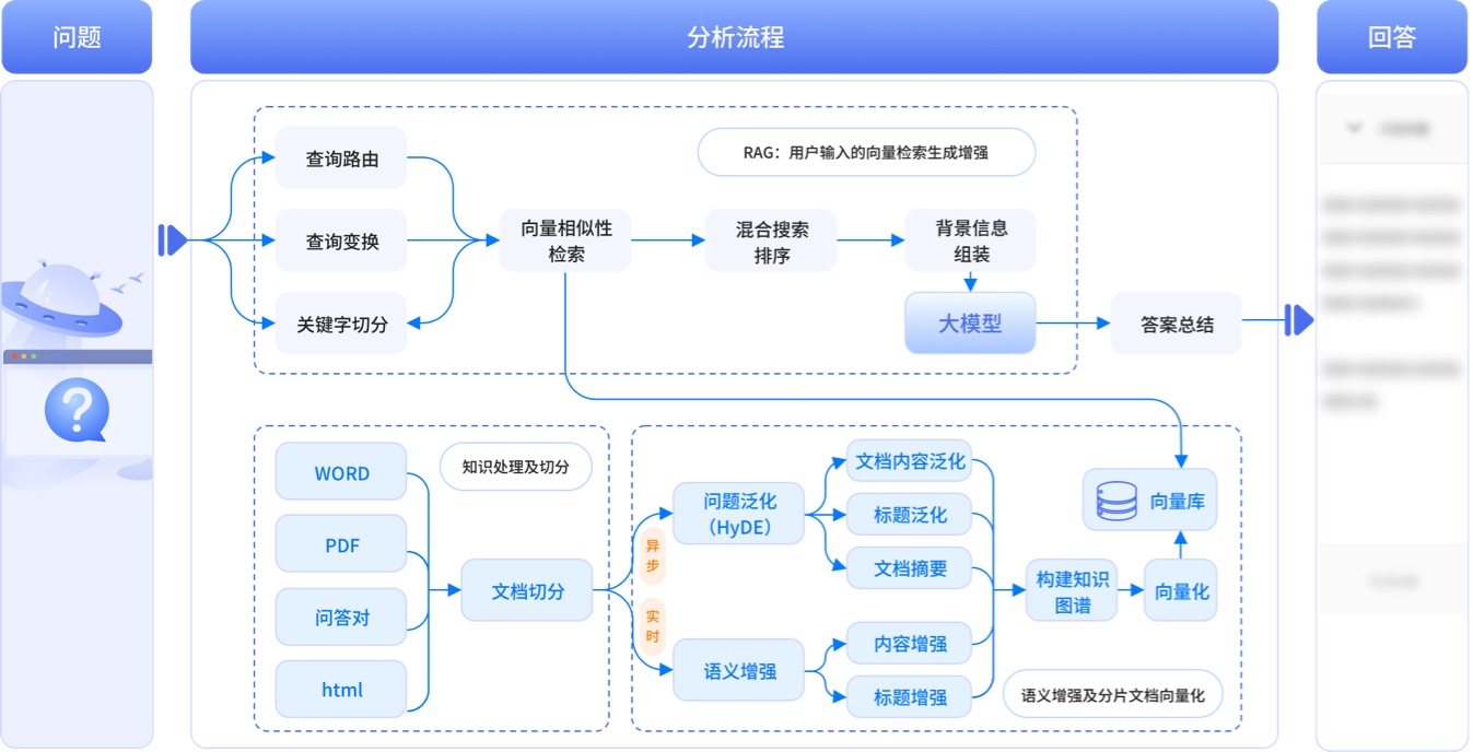 宝兰德一直致力于将先进的AI技术应用于产品中,以提升产品的性能和用户体验。为了解决大模型在知识更新和准确性方面的问题,我们在AI智慧助手中内置了RAG流程,通过该流程的引入: