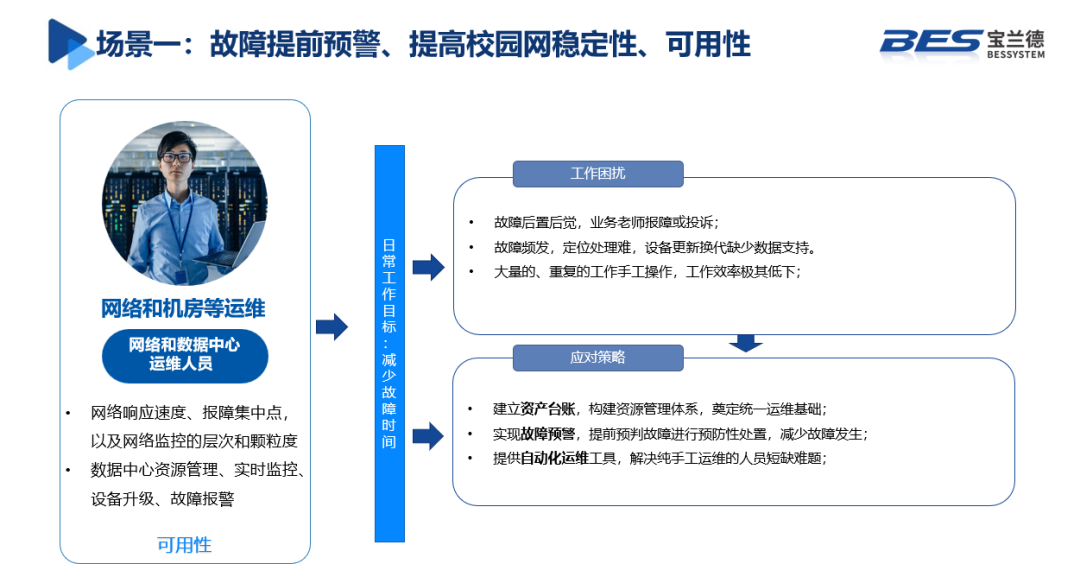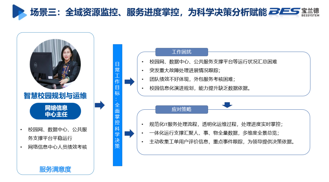 基于宝兰德高校一体化运行支撑平台的校园一体化运维,如同为高校信息化建设装上了“导航仪”,校方可以快速掌握信息化服务的全局建设情况、全局运行质量、全局服务效率,真正意义上实现“看得见、管得全、判得准”,为智慧高校建设提供全面的资产管理、全网融合监控、运维流程管理、多终端运维管理、用户视角运维专题、服务质量运营分析等能力,提升高校数字治理效率和水平,实现高校信息化运维治理工作的业务视角收敛和统一呈现,为数字校园的综合运营管理、科学决策提供技术支持,让运维不再“焦虑”。
