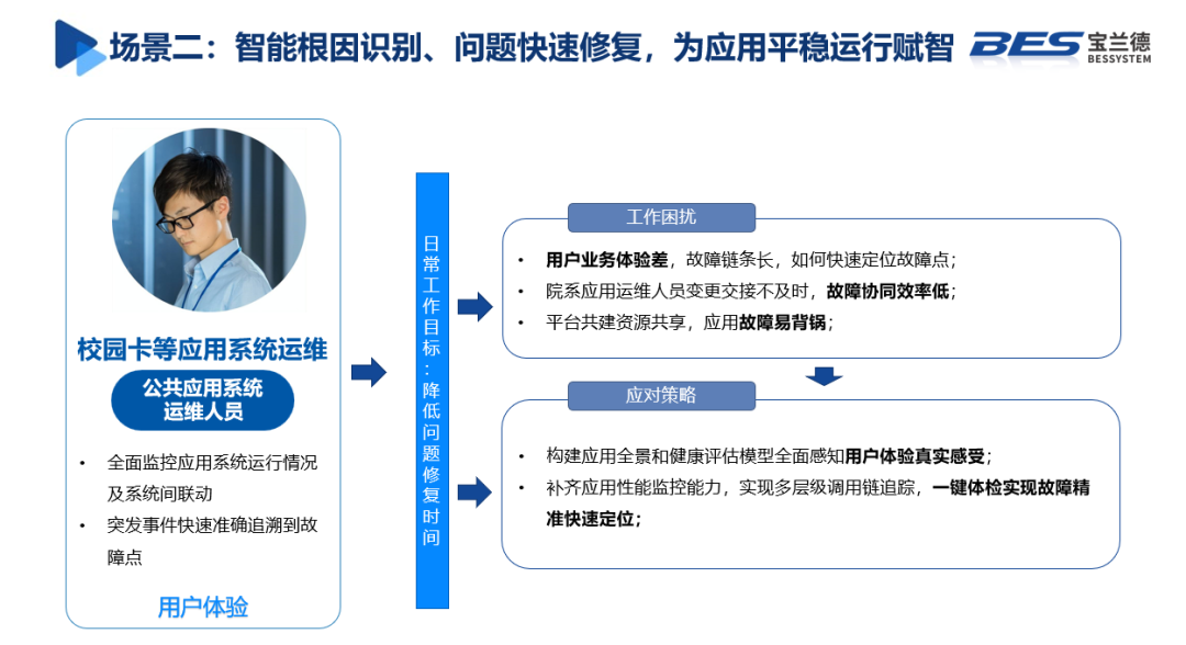 面对高校信息化部门IT运维现状,宝兰德基于自主可控中间件、智能运维、大数据等基础软件的产品能力和服务经验,积极探索教育行业信息化建设痛点,打造了宝兰德智慧校园一体化运行支撑平台。