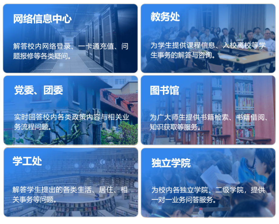 利用大模型识别意图和机器人高速响应,提升师生服务体验度及服务质量,不断完善教务、校园、信息化、图书馆、就业等领域的知识,让师生切身体会整体数字校园的建设成效。