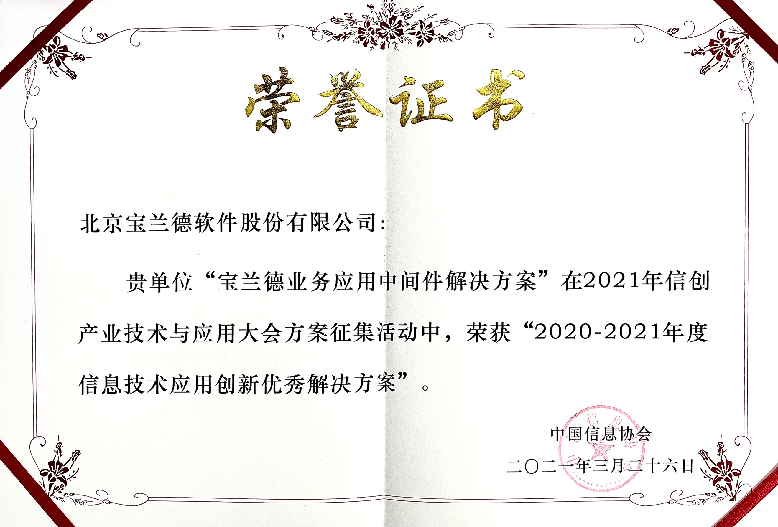 在中国IT服务&商业伙伴全媒体平台总编李卫忠发布的“年度信息技术应用创新案例、优秀方案征集成果”中,“宝兰德业务应用中间件解决方案”荣获“2020-2021年度信息技术创新应用优秀解决方案”奖。
